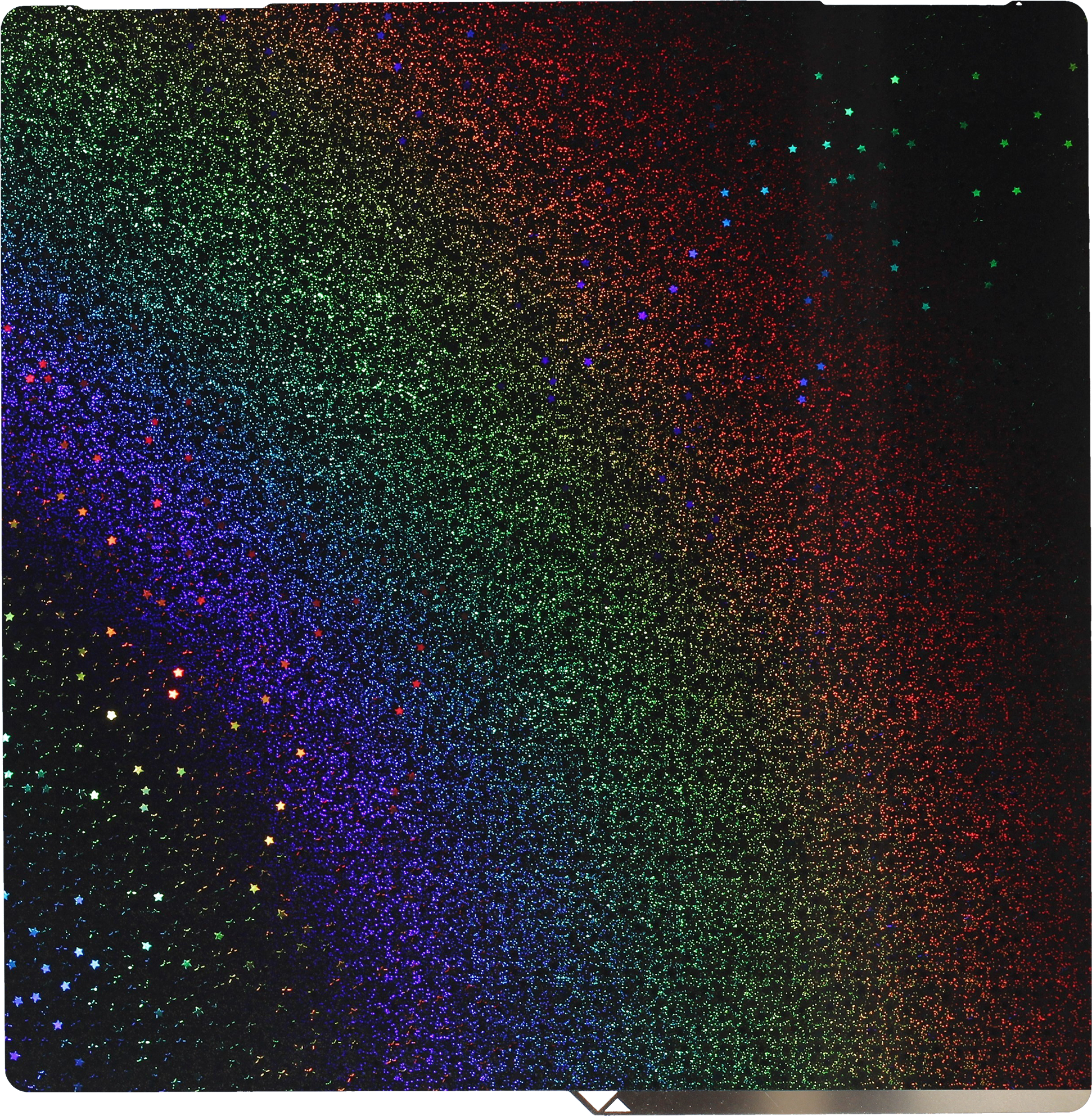 PET/PEI-byggplattan Magic från 3DJAKE är en flexibel, dubbelsidigt belagd byggplatta med magnetisk bas. Den ena sidan av byggplattan är tillverkad av PET-material med ett skimrande regnbågsmönster, vilket ger de utskrivna objekten unika visuella effekter. Den andra sidan har en pulverlackerad PEI-beläggning för utmärkt vidhäftning och enkel borttagning av modellerna.