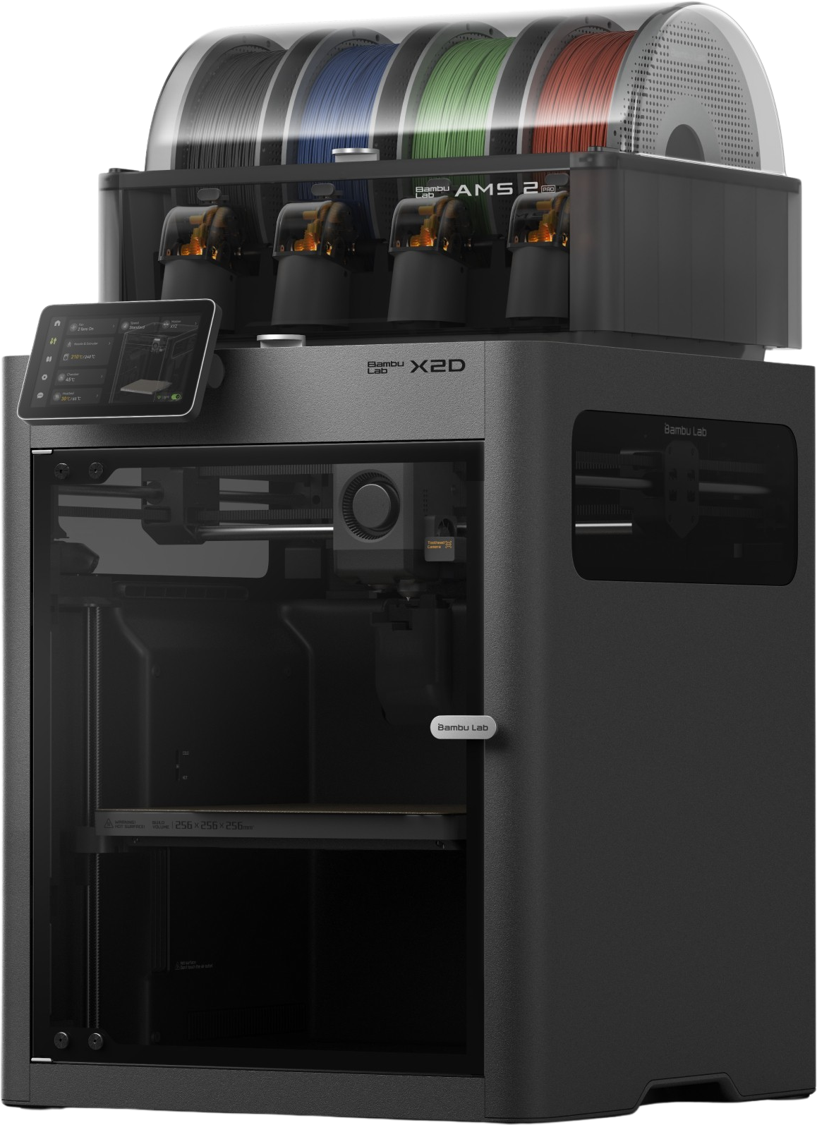 Bambu Lab X2D 3D-skrivare är nästa utvecklingssteg i Bambu Lab X-serien och är särskilt framtagen för exakt multi-material 3D-utskrift med stödstrukturer. Med sitt dual-extrudersystem, slutna uppvärmda byggkammare och intelligenta sensorer riktar sig X2D till dig som vill skapa högkvalitativa funktionella delar, komplexa geometrier och rena supportytor. I kombination med AMS 2 Pro möjliggör X2D dessutom automatiserad multi-material- och flerfärgsutskrift med smart filamentbyte och integrerad torkning.
