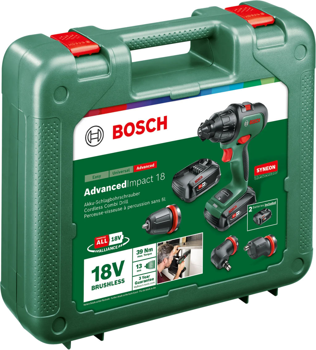 Med AdvancedImpact 18 från Bosch kan du enkelt bemästra ett brett utbud av borr-, skruvdragnings- och slagborrningsuppgifter utan att belasta händer och armar. Den ergonomiska enheten ligger bekvämt i handen och säkerställer en naturlig hållning, även när du arbetar under långa perioder. Med ett kraftfullt litiumjonbatteri erbjuder verktyget lång drifttid och korta laddningstider utan avbrott. Idealisk för skruvdragning, borrning i trä och metall samt slagborrning i tegel och kalksten.