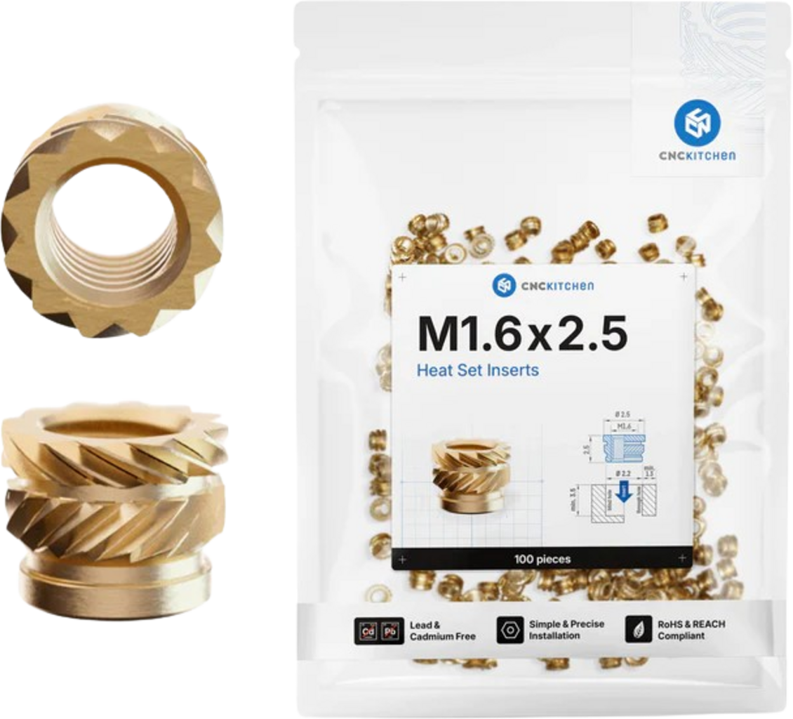 Tips: För anslutningar med maximal hållfasthet bör du installera mässingsinsatserna vid en temperatur som är 10-20 °C högre än trycktemperaturen. CNC Kitchen rekommenderar också att endast smälta 90% av gänginsatserna med en lödkolv - resten kan monteras i komponenten med hjälp av verktyg.
