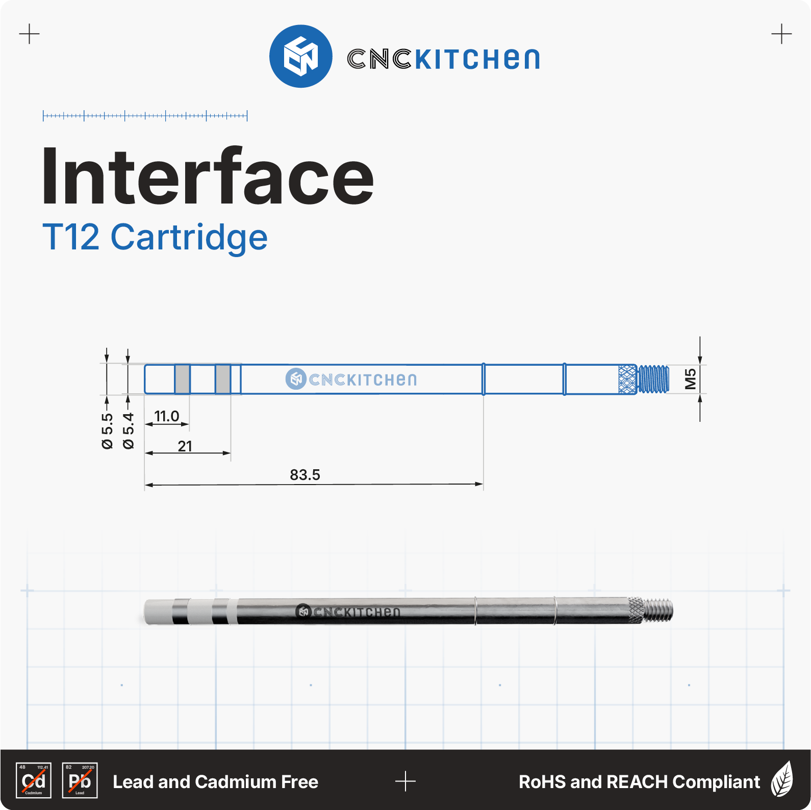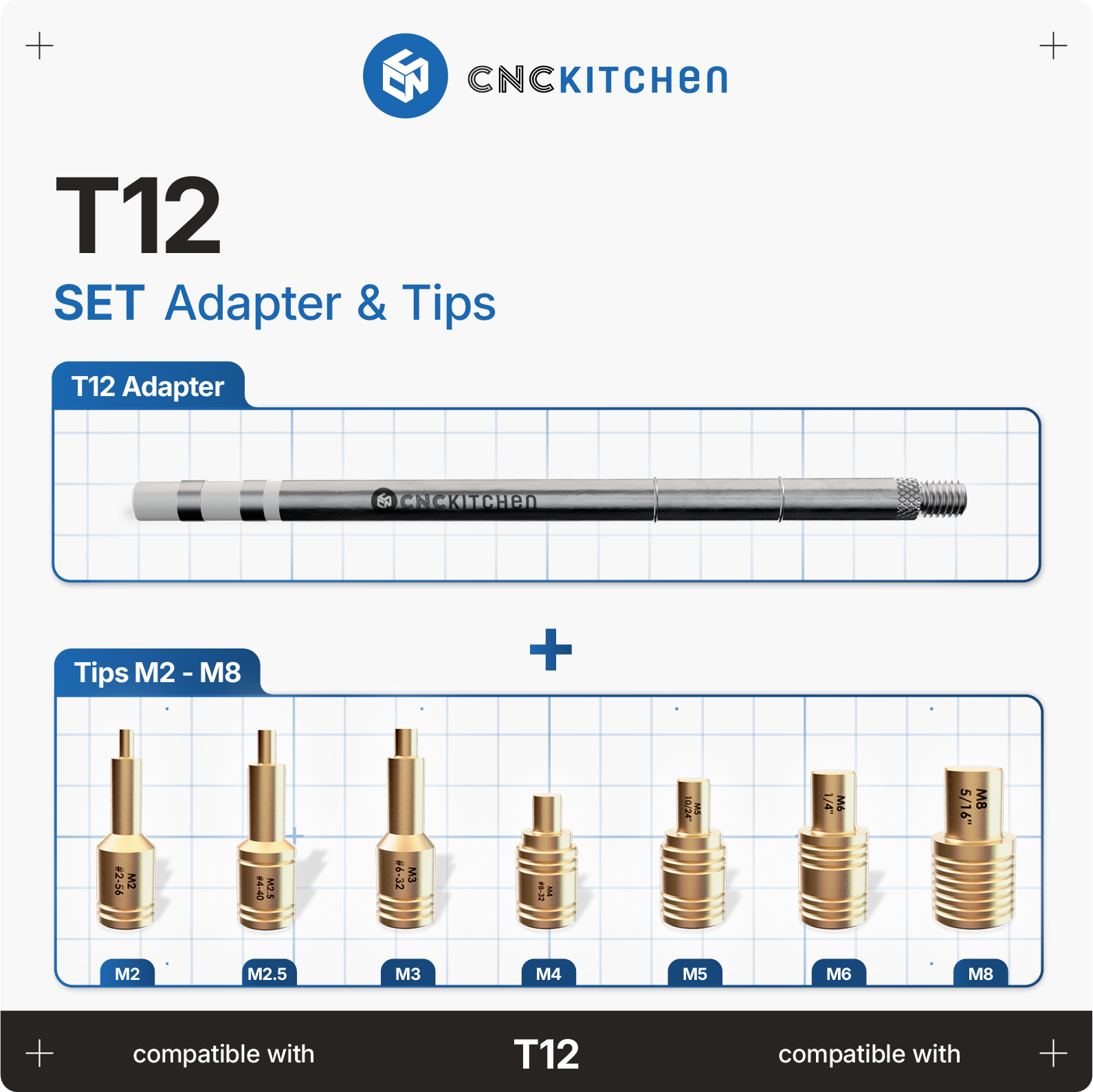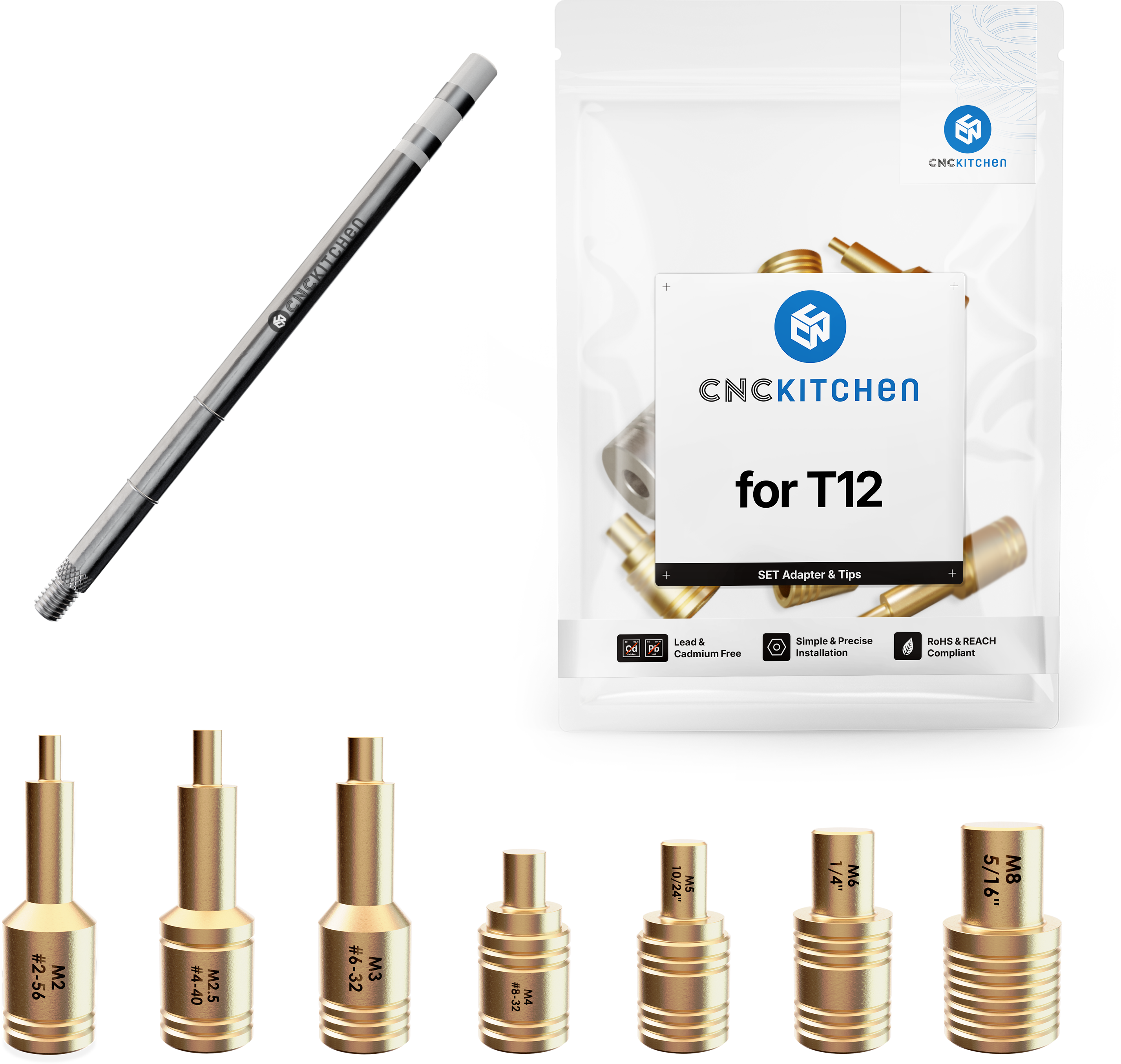 Lödspetsarna är kompatibla med T12-standardlödkolvar och är perfekt anpassade till CNC Kitchen-gängade insatser. De har lasermärkning och skåror för enkel storleksmärkning.