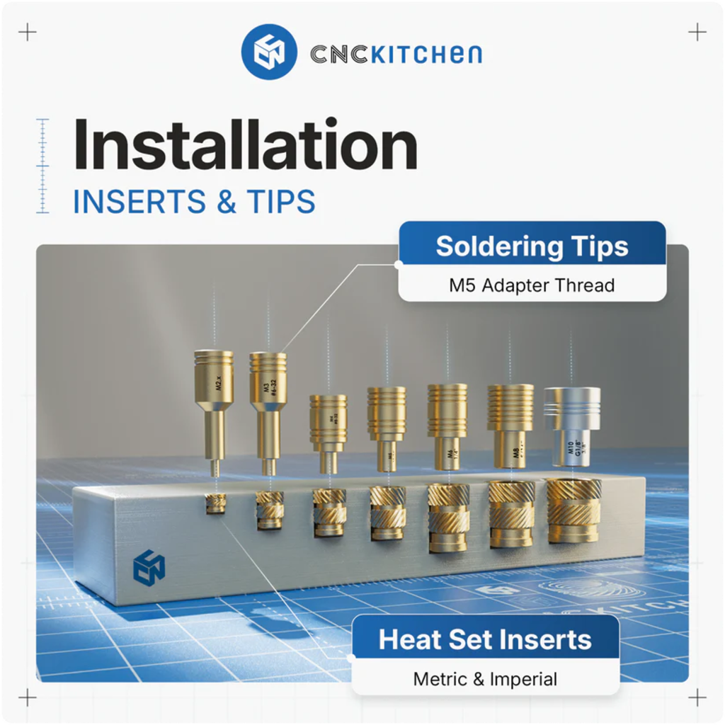 Lödspetsarna är kompatibla med T18- och 900M-lödkolvar (t.ex. Hakko, Lenovo, Sremtch) och är perfekt anpassade till CNC Kitchen-gänginsatser. Lödspetsarna har lasermärkning och skåror för enkel storleksmärkning. Överensstämmer med REACH och RoHS.