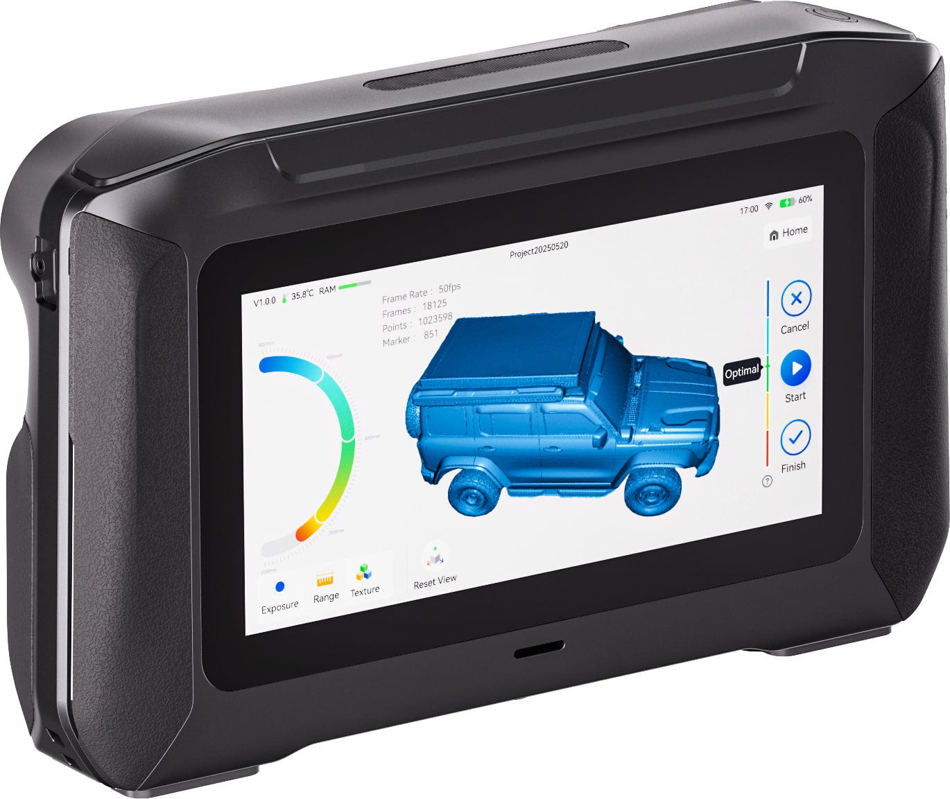- integrerad allt-i-ett-mjukvara för kalibrering, skanning, punktmolnsfusion, mesh-bearbetning och sammanslagning av flera skanningar direkt på enheten.