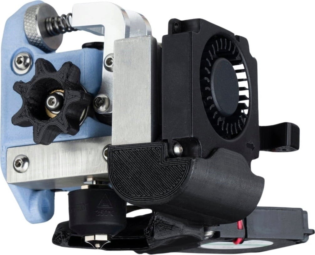 Kylflänsar har placerats på sidan av kylblocket i syfte att göra filamentbanan så kort som möjligt. Denna förkortade filamentbana säkerställer att extrudern reagerar snabbare och mer exakt och att knäckning inte uppstår. De vassa tänderna på de två drivhjulen griper särskilt hårt tag i filamentet från båda sidor och trycker det inte bara smidigt utan också jämnt in i hotend.
