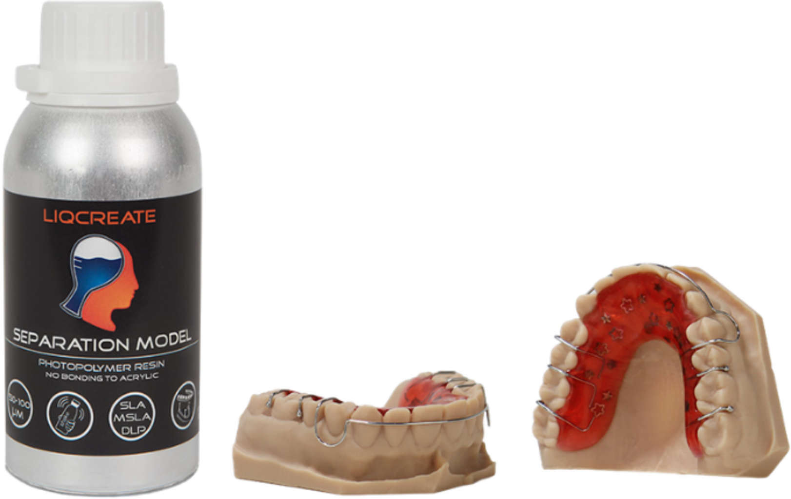Liqcreate Separation Model Resin är ett specialutvecklat fotopolymerresin för 3D-utskrift av dentalmodeller med separationsegenskaper jämfört med akrylbaserade material. Detta gör att ortodontiska apparater och andra kallhärdande akrylsystem kan tillverkas direkt på den utskrivna modellen utan att materialet permanent fäster på modellen.