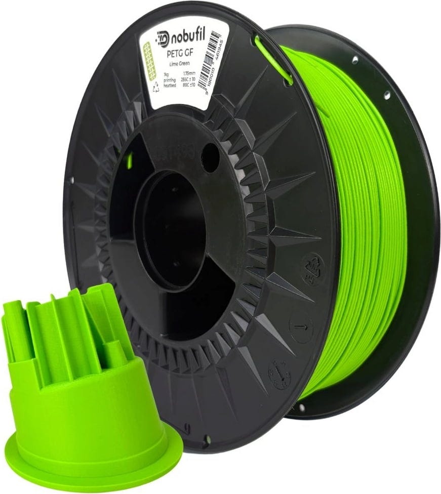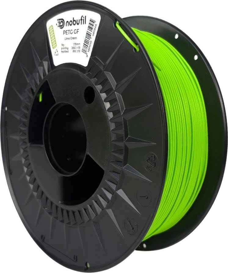 nobufil PETG GF är ett PETG-filament med 10 % glasfiberförstärkning som tillverkas av återvunnet industriavfall från Europa. Tillsatsen av glasfiber ger materialet betydligt högre styvhet, hållfasthet och måttnoggrannhet, vilket gör det väl lämpat för tekniska och mekaniskt belastade komponenter.