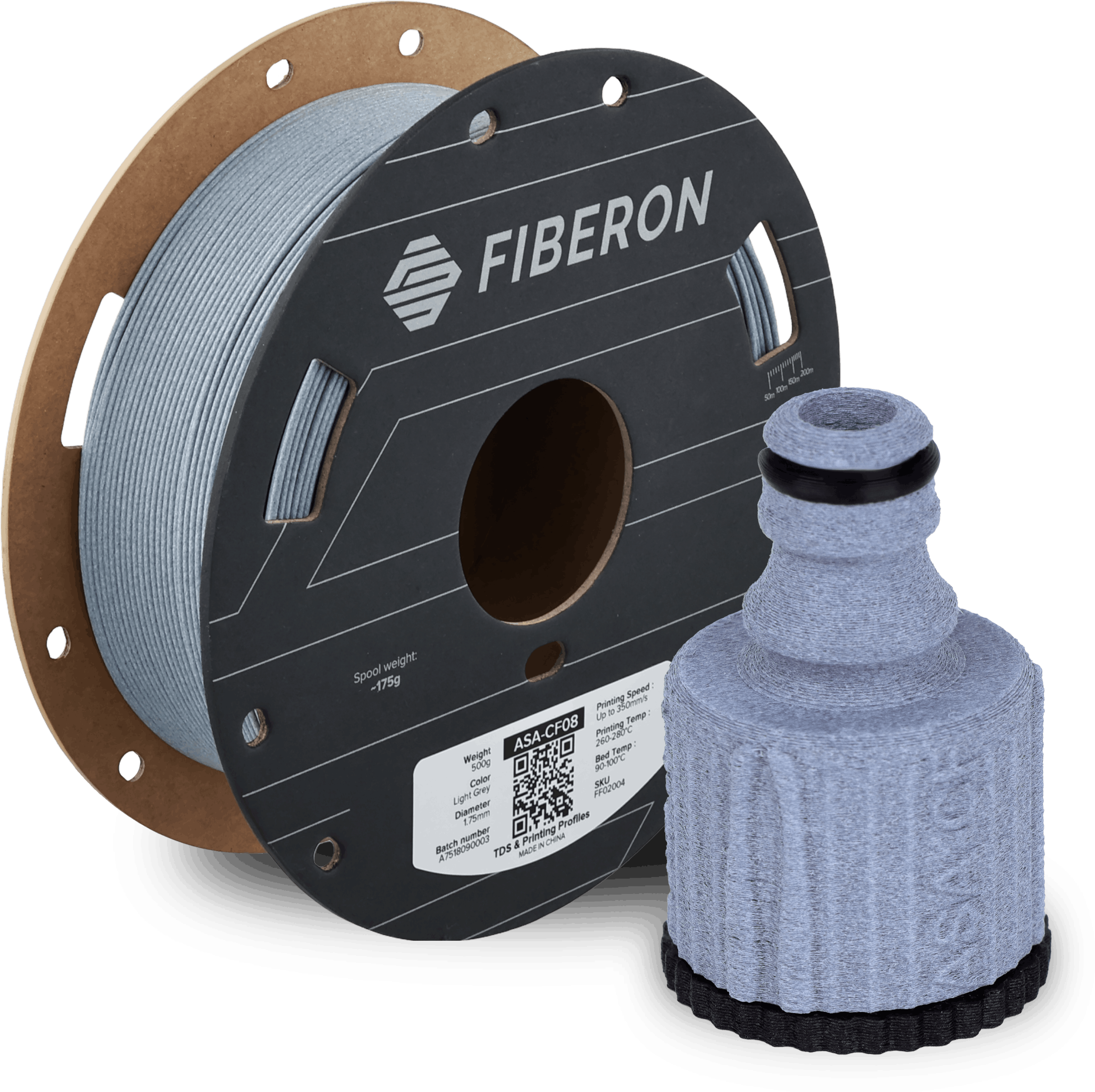 Fiberon™ ASA-CF08 är ett högpresterande filament baserat på akrylnitril-styren-akrylat (ASA), förstärkt med 8 % kolfiber. Resultatet är ett material med exceptionell styvhet, hög dimensionsstabilitet och en matt, lätt texturerad yta som imponerar både mekaniskt och estetiskt.