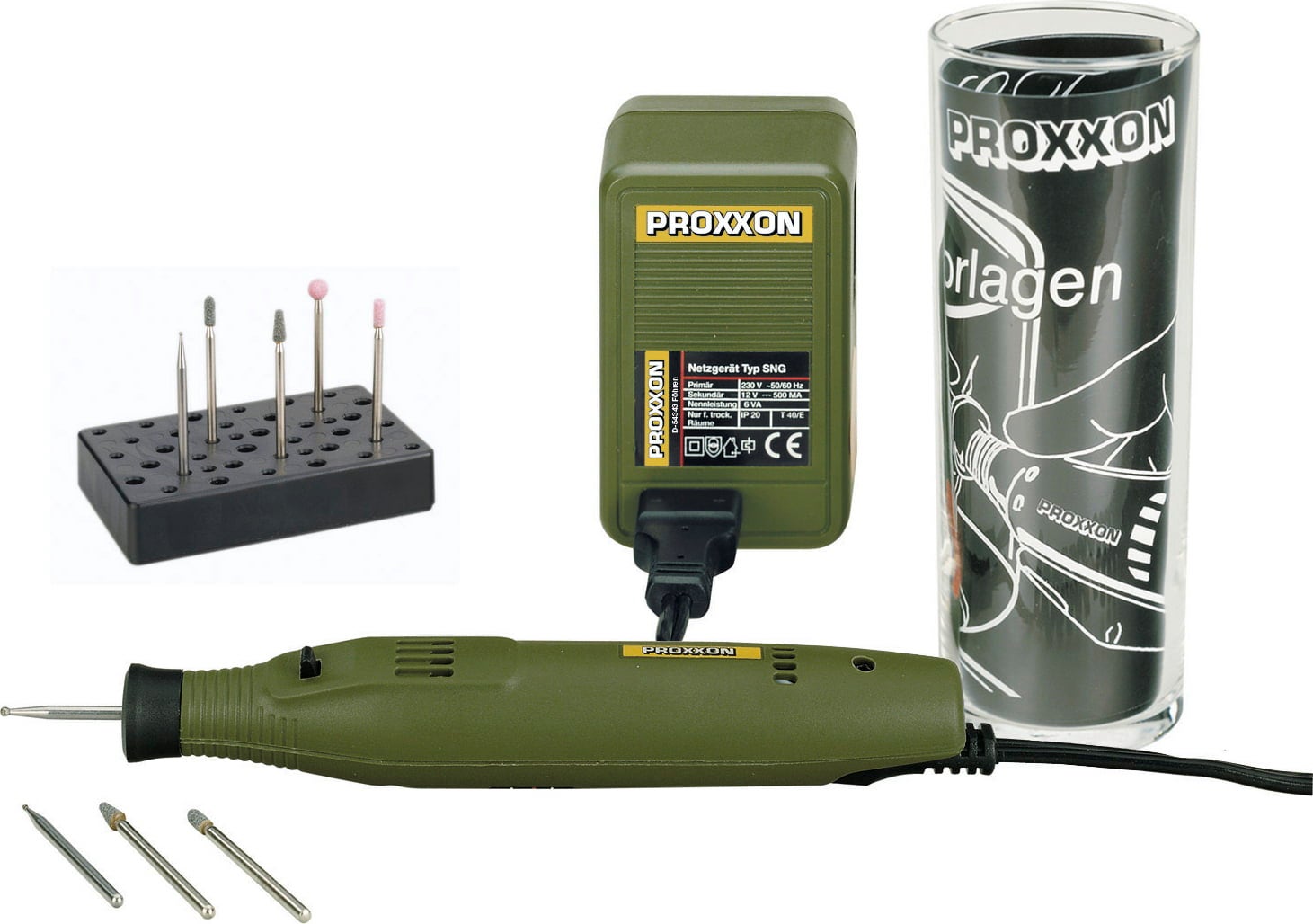 Proxxons graveringsset med graveringspenna GG 12 är perfekt för fina gravyrer, märkning och kreativa projekt på många olika material. Den kraftfulla DC-motorn arbetar tyst, vibrationsfritt och med lång livslängd. Höljet av glasfiberförstärkt polyamid är både lätt och robust.
