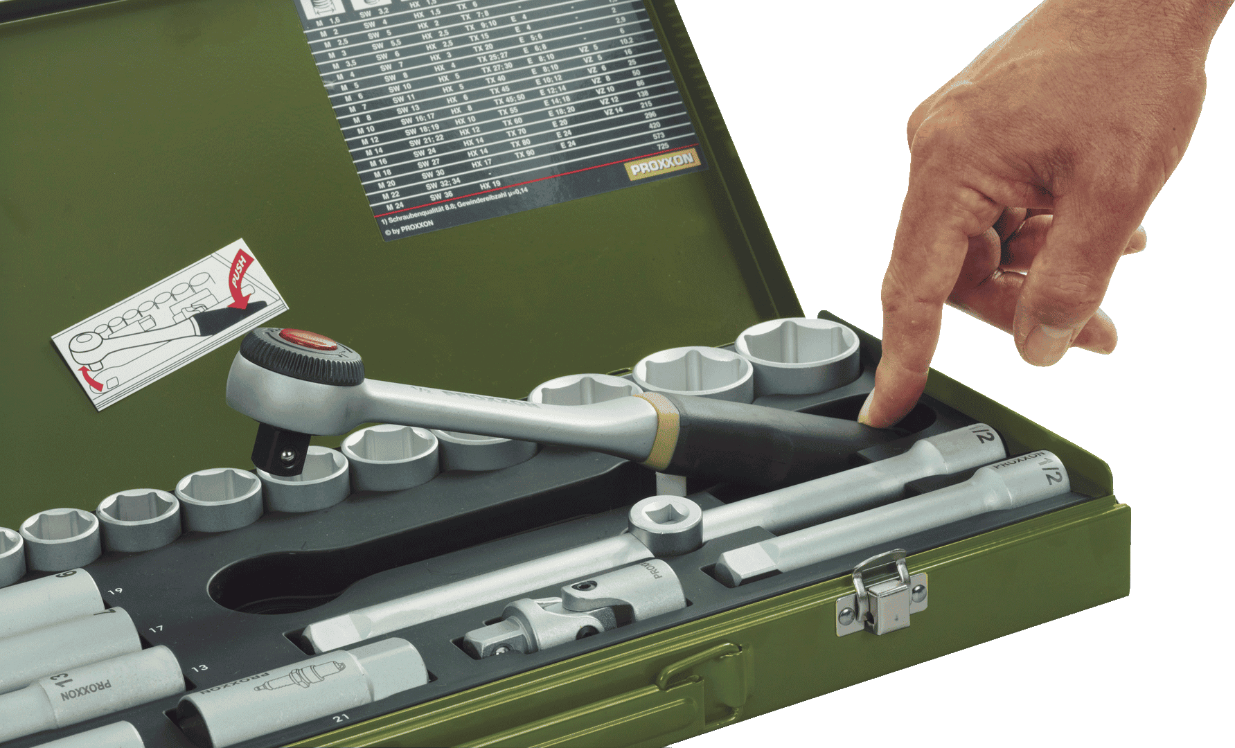 Kärnan i satsen är 1/4""-spärrskaftet, smitt och härdat i ett stycke CrV-stål. Den precisa 52-tandade mekanismen gör att flera tänder griper in samtidigt och överför mycket högt vridmoment på ett säkert sätt. En integrerad frigöringsmekanism gör det möjligt att snabbt lossa insatserna med en knapptryckning. Ytan är dubbelt förnicklad och därefter mattförkromad för optimalt skydd. Det ergonomiska handtaget i olje- och syrabeständigt TPR är fast monterat och har upphängningshål.