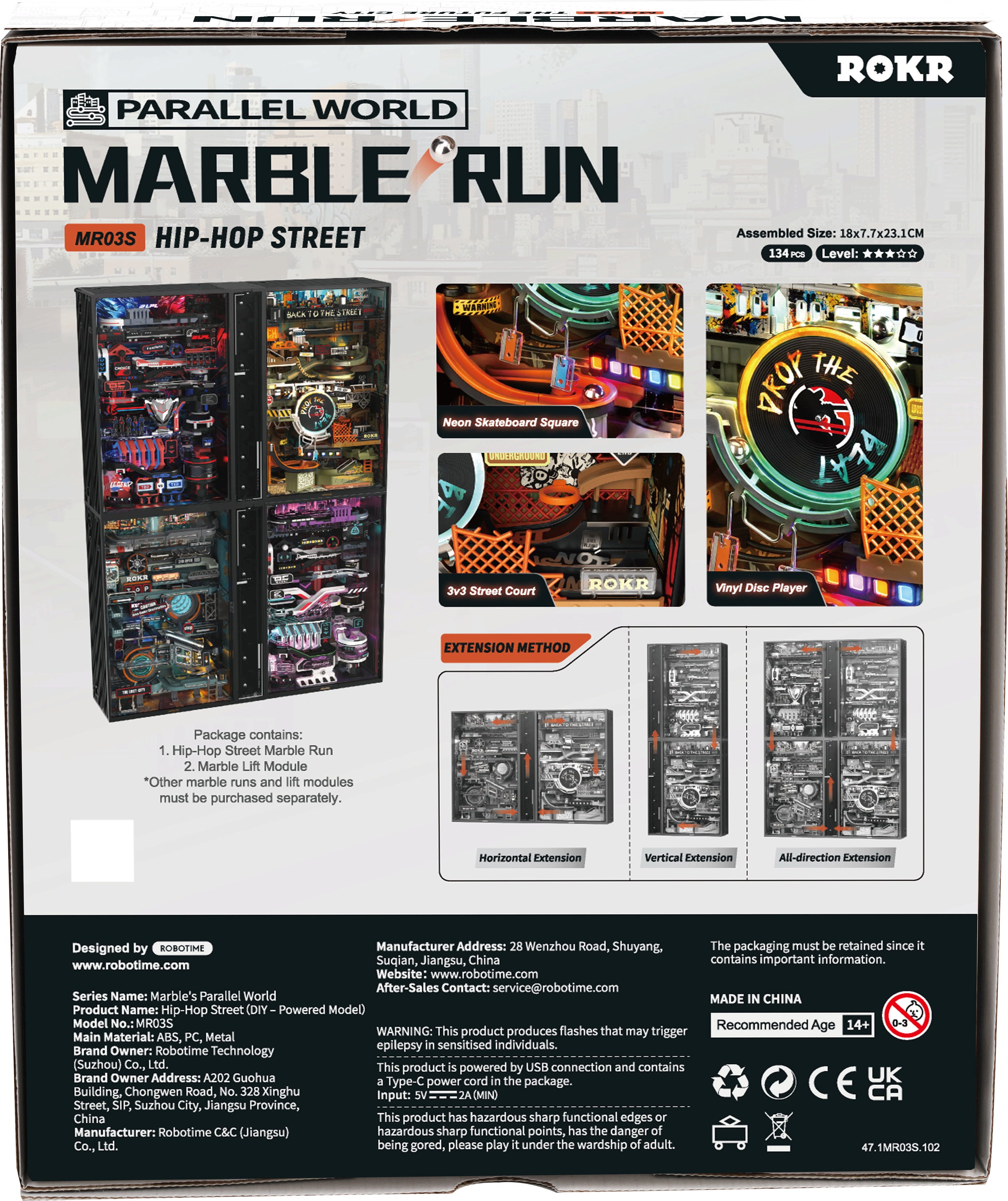Välkommen till ROKR Hip-Hop Street. Här rullar kulor inte bara genom banor – de rör sig i stadens rytm. Graffiti på väggarna, guldkedjor i designen, en snurrande vinylskiva i centrum och en skatepark som ser ut som om den just sprayats med neonfärg. Detta 3D träpussel är en urban lekplats inspirerad av street culture, musik och rörelse.