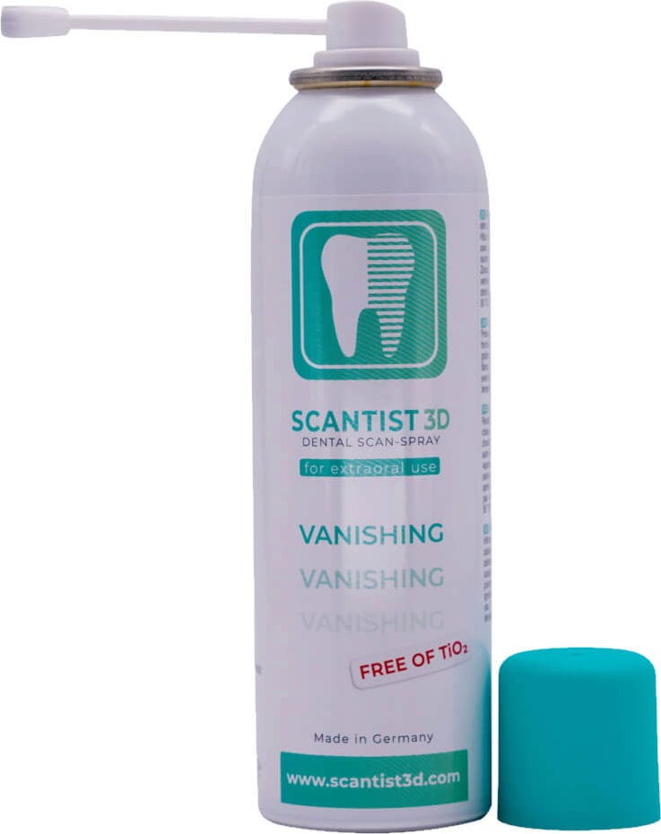 SCANTIST 3D Vanishing Spray är en extraoral skanningsspray för användning inom dentalområdet. Den används för att optimera inspelningskvaliteten för CAD/CAM-inspelningar, kamera/videoinspelningar, strukturerade ljusskanningar, blåljusskanningar, etc.