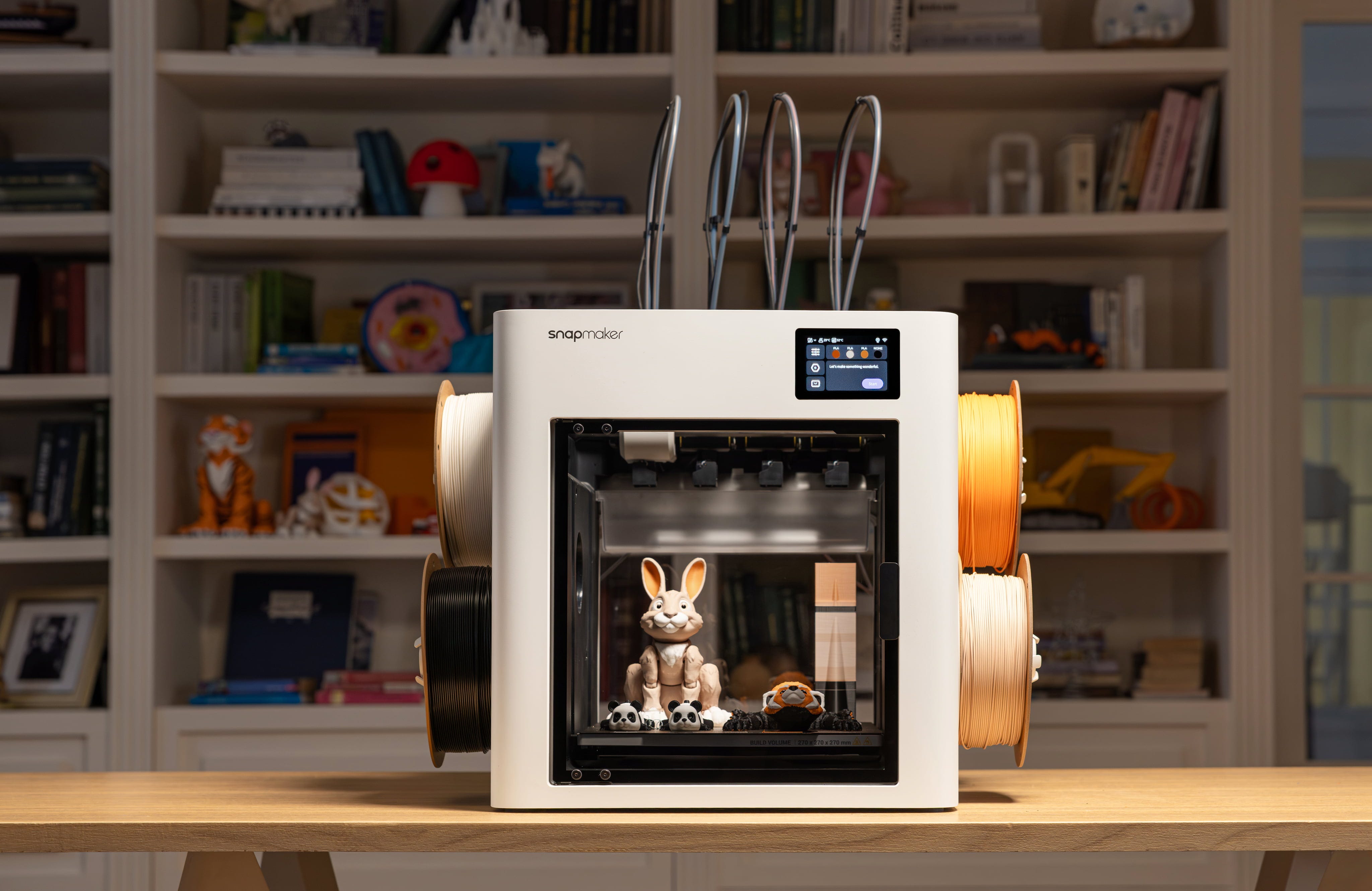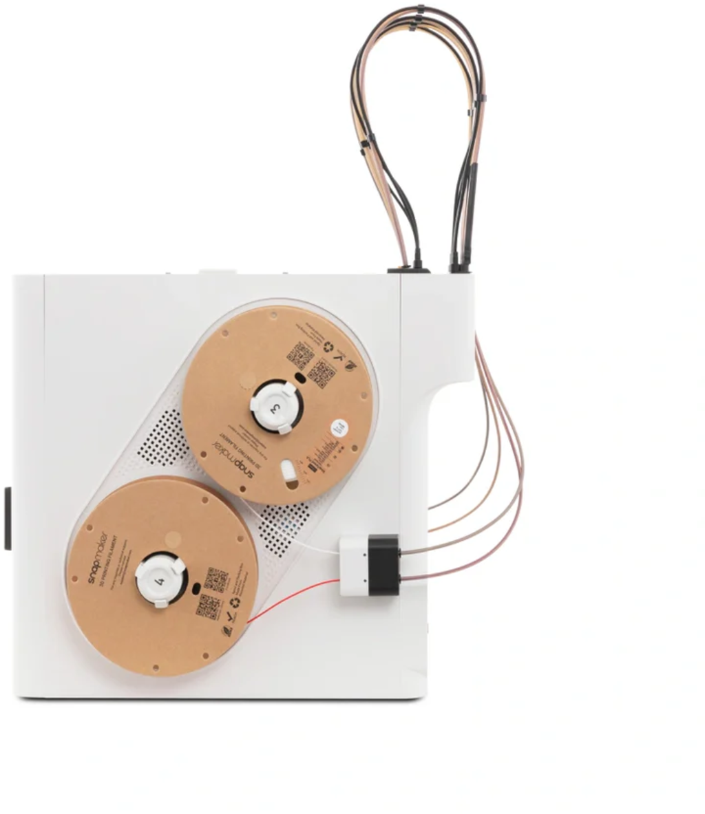 Det automatiska filamenthanteringssystemet håller upp till fyra spolar redo. Filament matas in automatiskt, Snapmakers egna filament känns igen via RFID, och när en spole tar slut sker bytet automatiskt i Backup Mode - för oavbrutna utskrifter utan manuell inblandning.