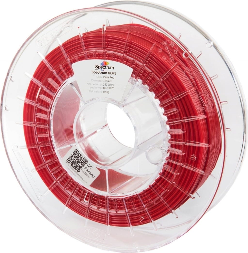 Spectrum HDPE är ett av världens första HDPE-filament med en innovativ low-warp-formulering. Polyeten med hög densitet har traditionellt varit svårt att skriva ut. men Spectrum har omdefinierat materialet från grunden! Resultatet är ett tekniskt högpresterande filament som är extremt slitstarkt, kemikalieresistent och samtidigt förvånansvärt lätt att arbeta med.