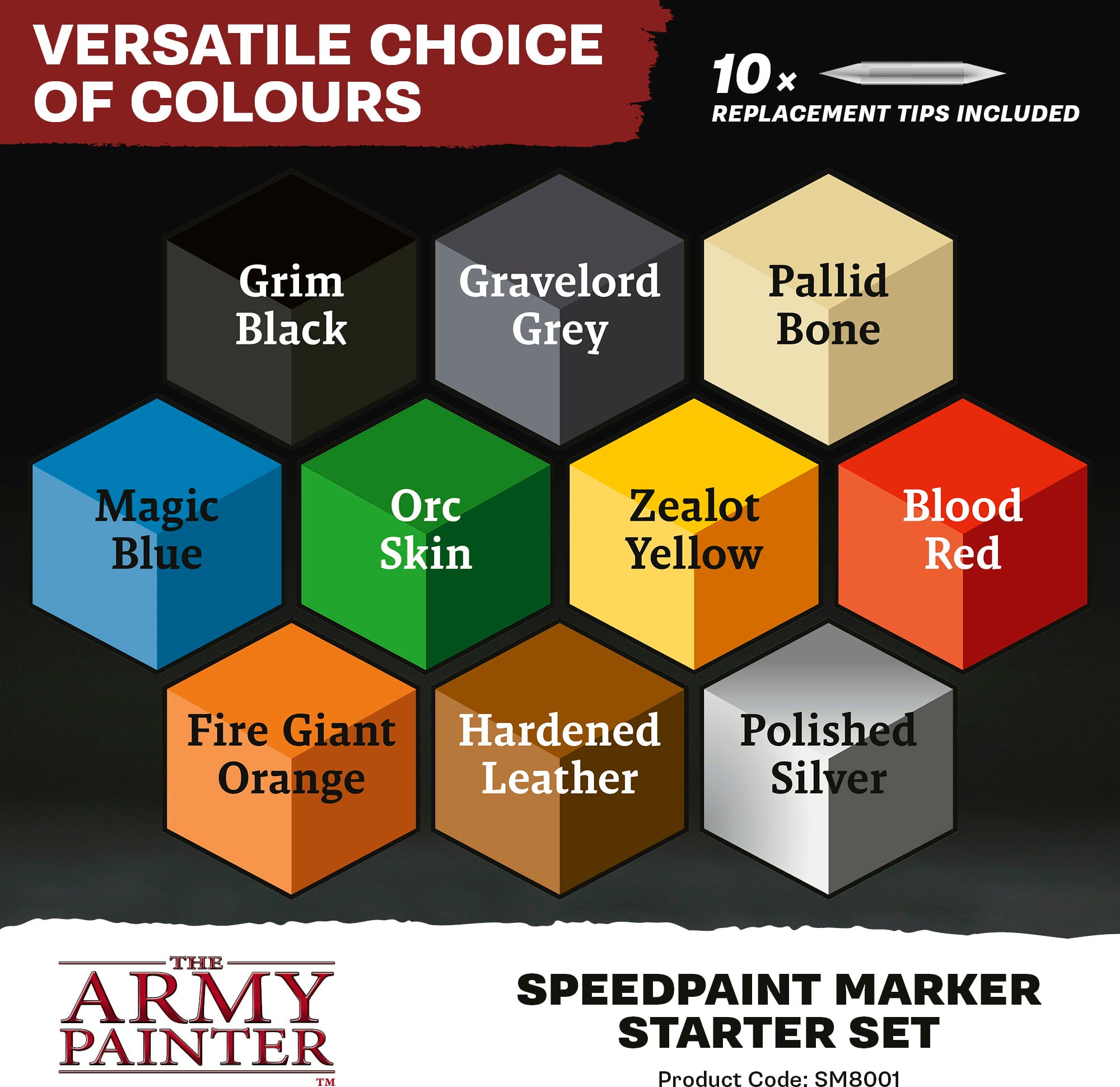 Startsetet innehåller 10 färger: 9 fylliga akrylfärger och 1 metallicnyans. Så du kan måla dina miniatyrer i detalj eller designa hela ytor på rekordtid - utan penslar, utan palett, utan att städa upp. Och det bästa av allt: markörerna ryms i vilken väska som helst, så att du kan ta med dig din hobby vart du än går!