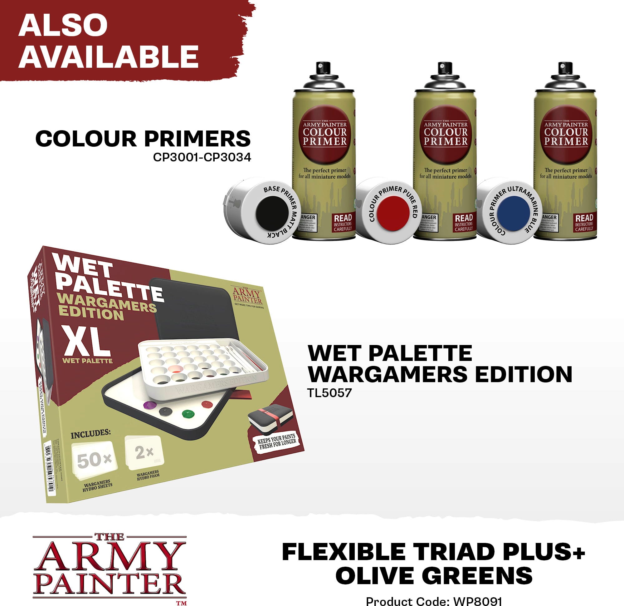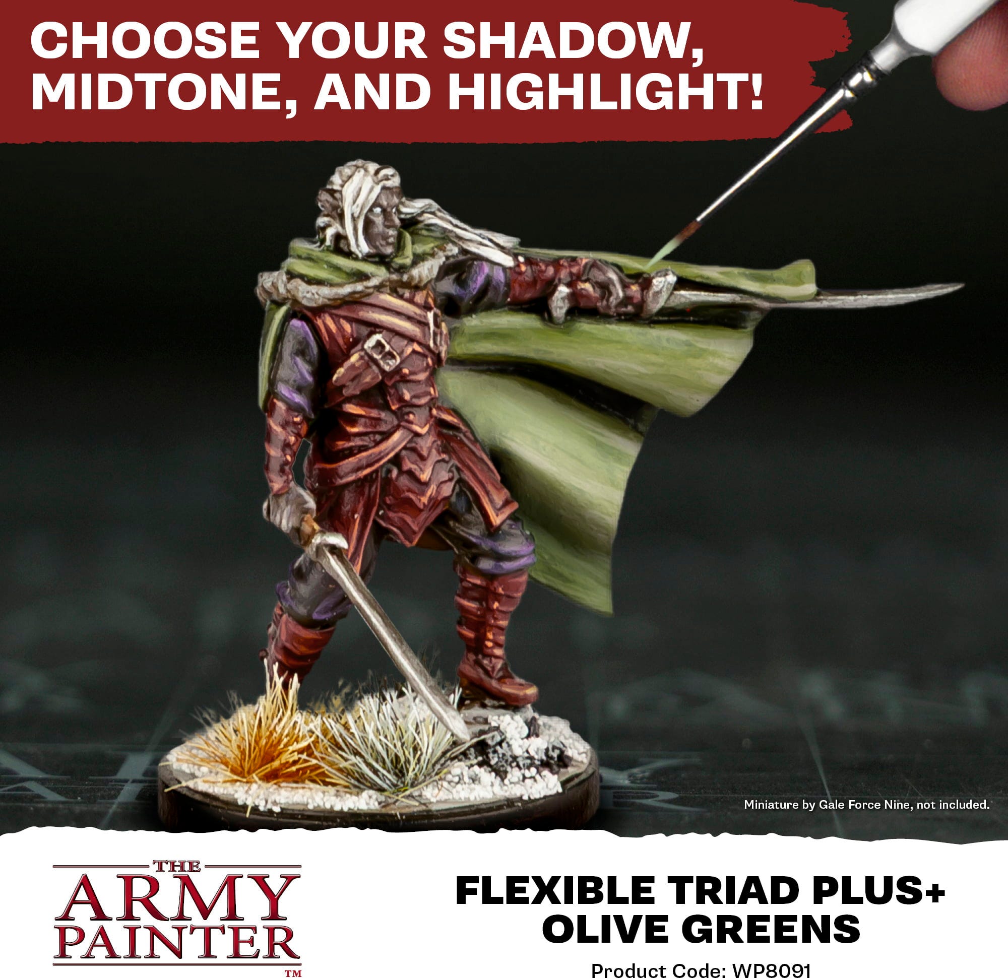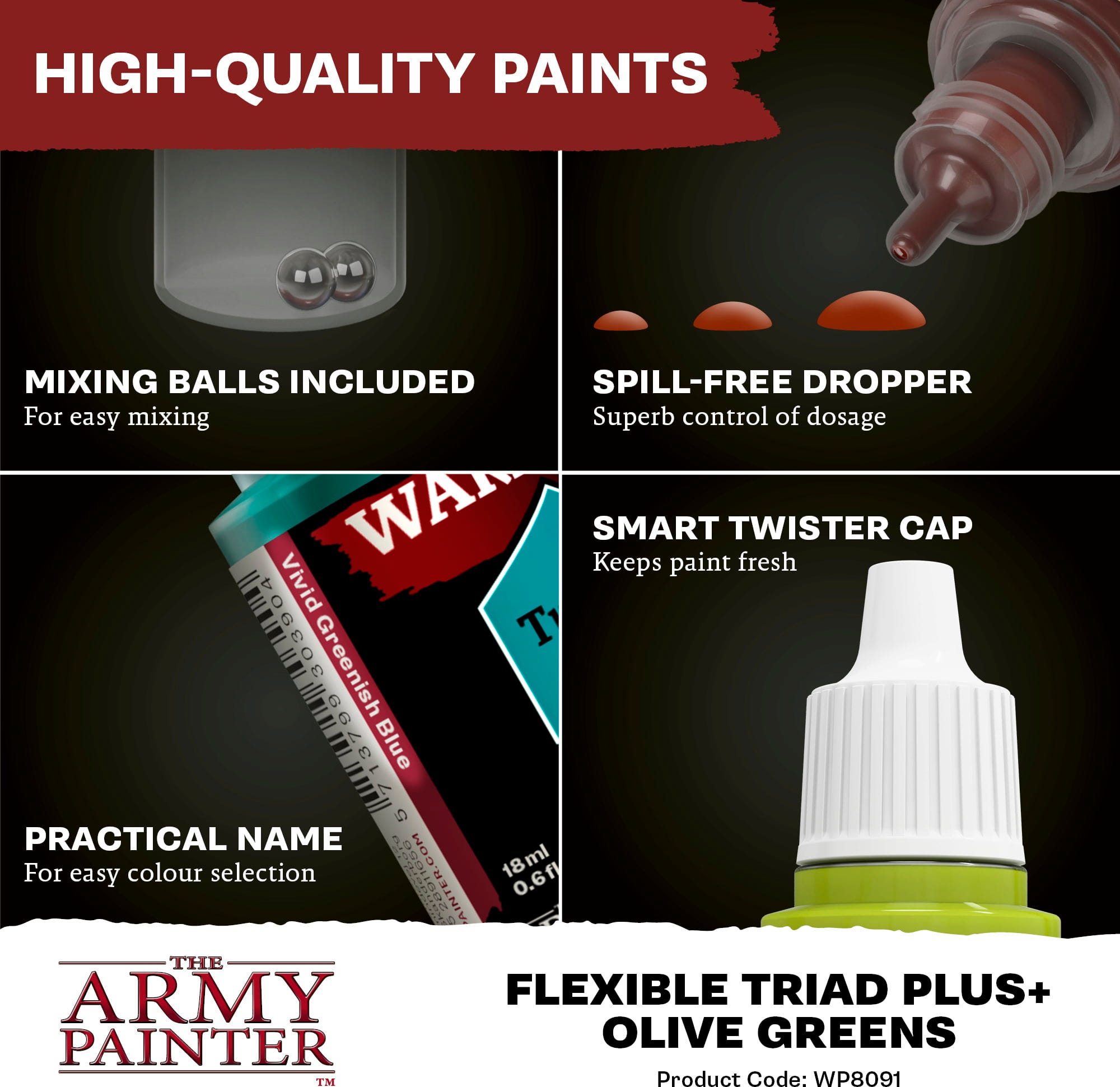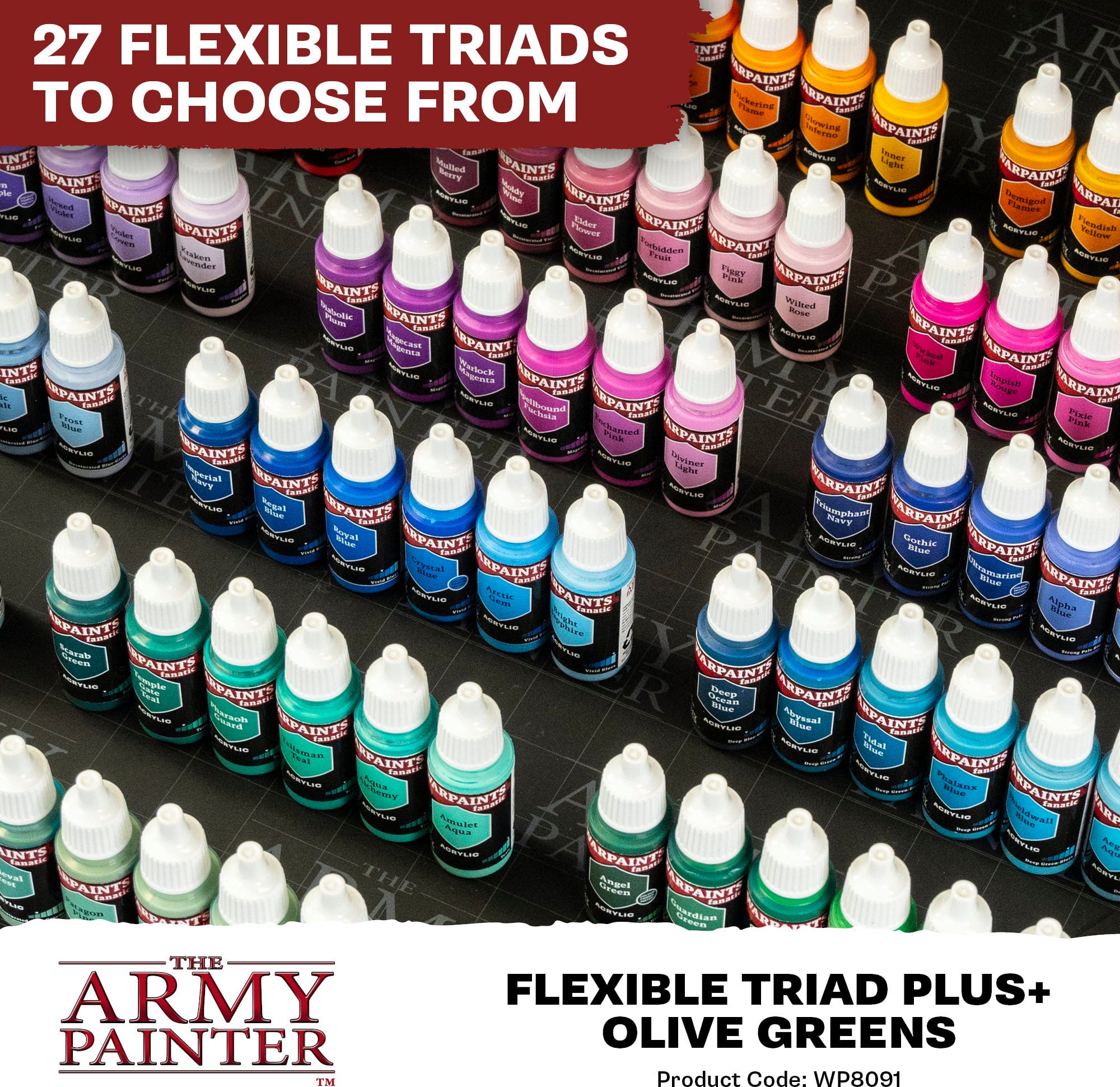 Med Flexible Colour Triad System har The Army Painter tagit fram ett smart koncept som förenklar färgblandning och färgval vid målning av miniatyrer. Varje triad består av sex kulörer, som alla är baserade på en gemensam baskulör. Färgerna sträcker sig från mycket mörkt till mycket ljust och skapar en harmonisk färgpalett.